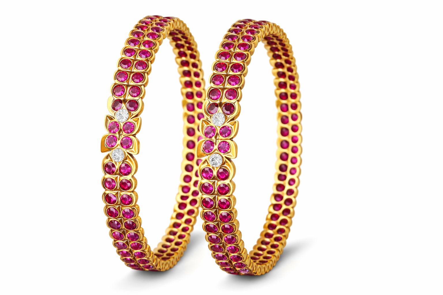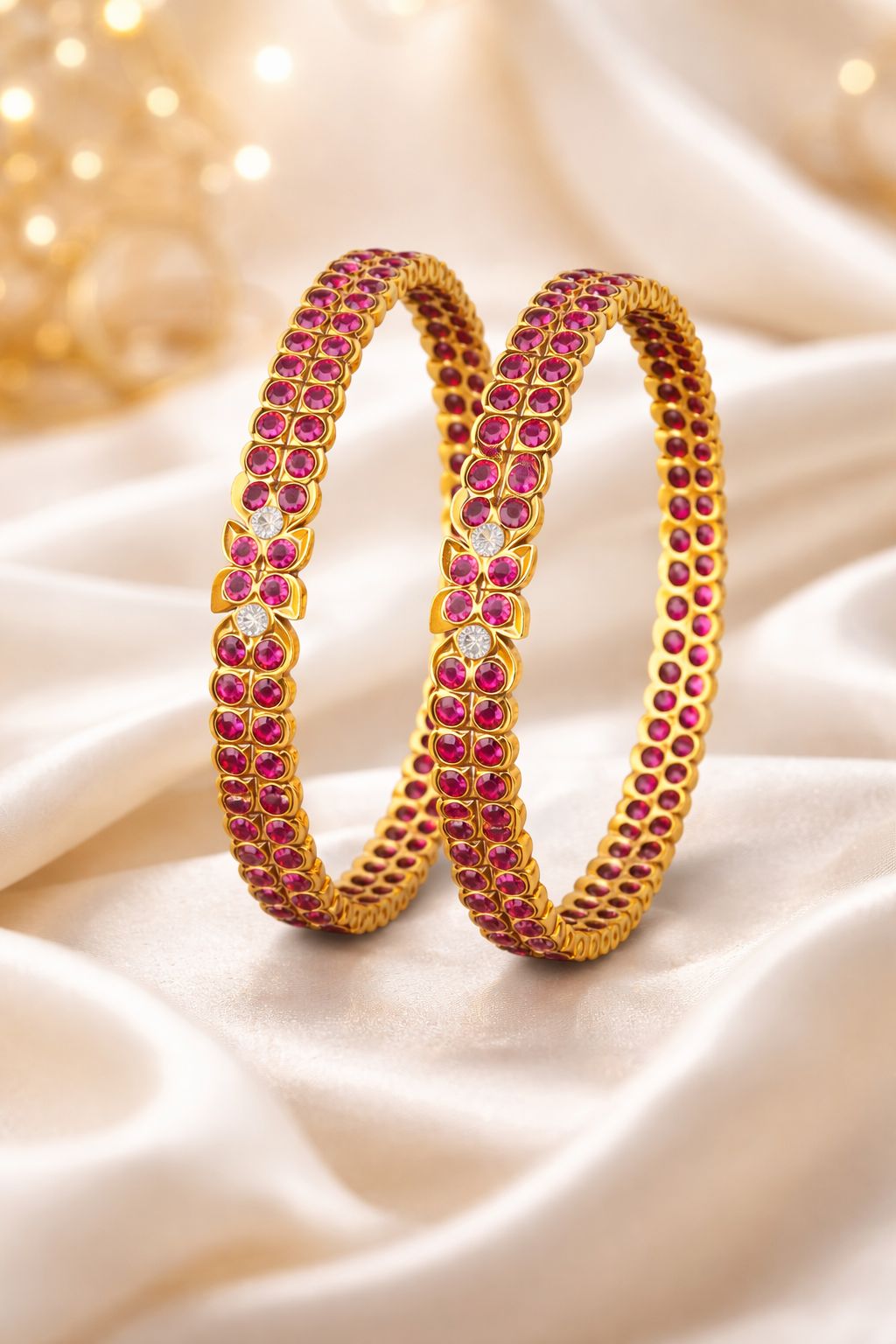Product Description: Enhance your traditional style with this elegant ruby stone gold-plated bangles set. Designed with sparkling red stones arranged in a beautiful pattern, these bangles feature a classic floral motif with subtle white stone highlights, giving them a rich and luxurious look. Crafted with premium quality materials, these bangles are lightweight, durable, and comfortable for daily wear as well as special occasions. Perfect for weddings, festivals, parties, and gifting, they add a graceful charm to any ethnic outfit. Key Features: * Premium Gold Plated Finish * Elegant Ruby Stone Design * Set of 2 Stylish Bangles * Floral Pattern with White Stone Highlights * Lightweight & Comfortable Fit * Ideal for Weddings, Festivals & Traditional Wear