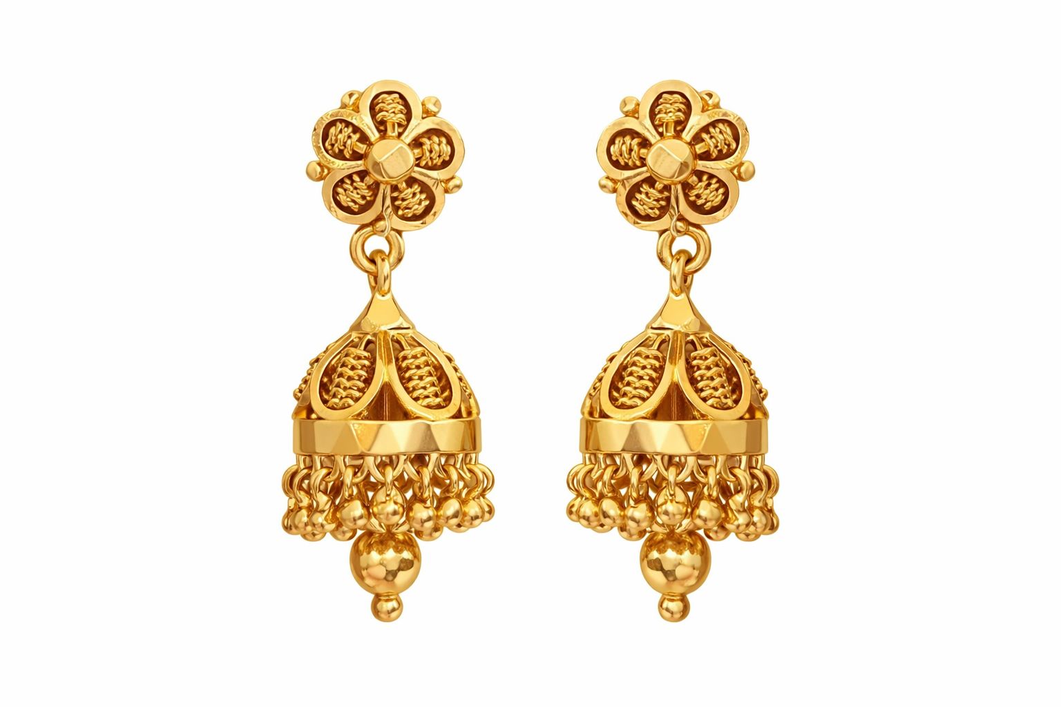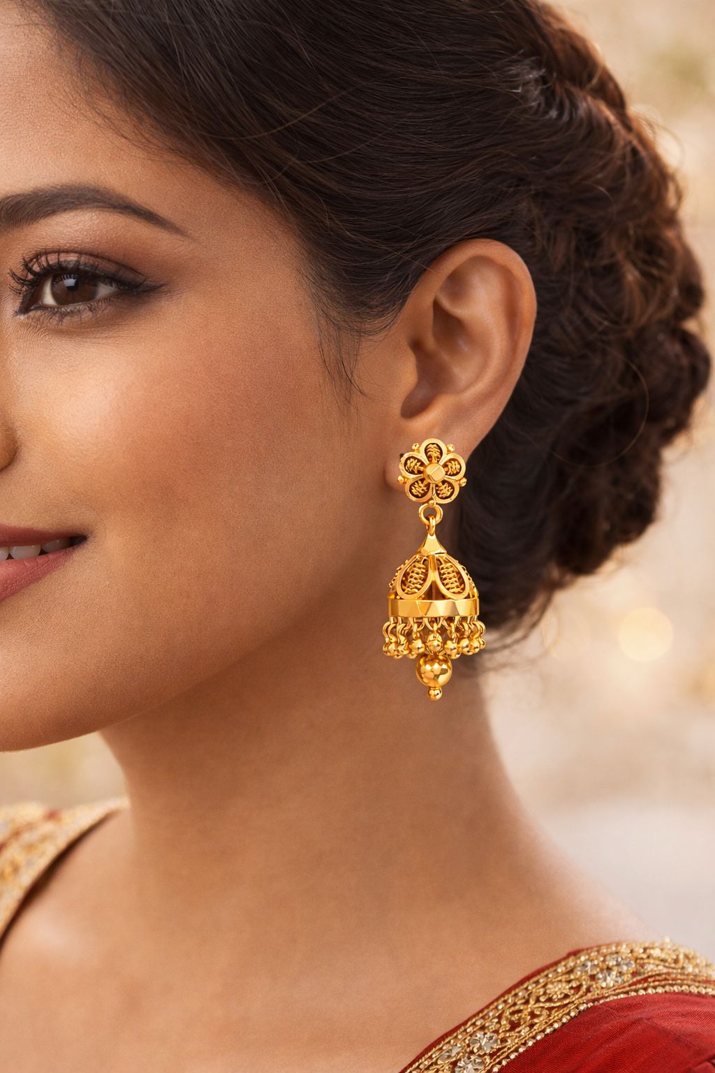 Enhance your ethnic look with these beautifully crafted traditional gold-plated jhumka earrings. Designed with an elegant floral stud and intricate temple-style dome, these earrings feature fine detailing and dangling beads that add a graceful charm to your appearance. Perfect for weddings, festivals, and special occasions, these earrings complement sarees, salwar suits, and lehengas effortlessly. Made with high-quality materials, they offer a rich look while remaining lightweight and comfortable for long wear. Key Features: * Premium gold-plated finish for a traditional look * Elegant floral stud with detailed jhumka design * Lightweight and comfortable for daily or occasional wear * Ideal for weddings, festivals, and gifting Important Note: * Cash on Delivery (COD) is not available for this product.